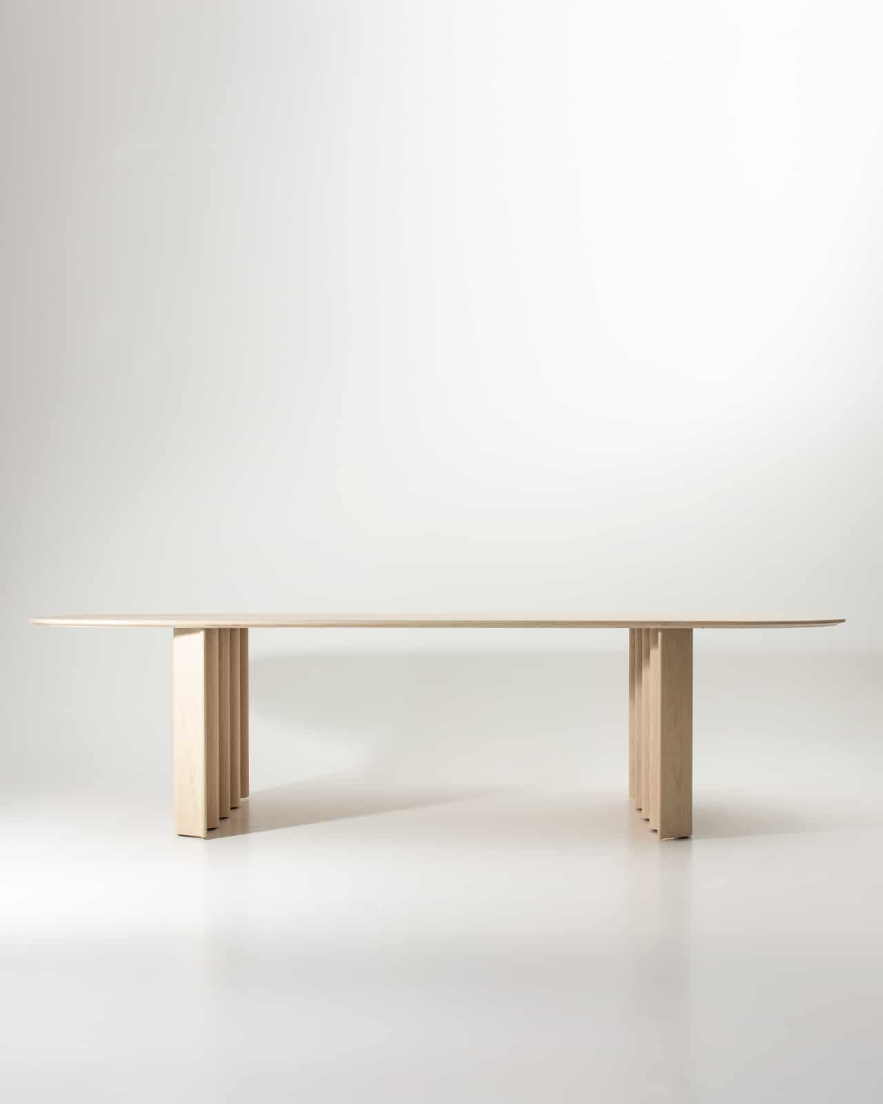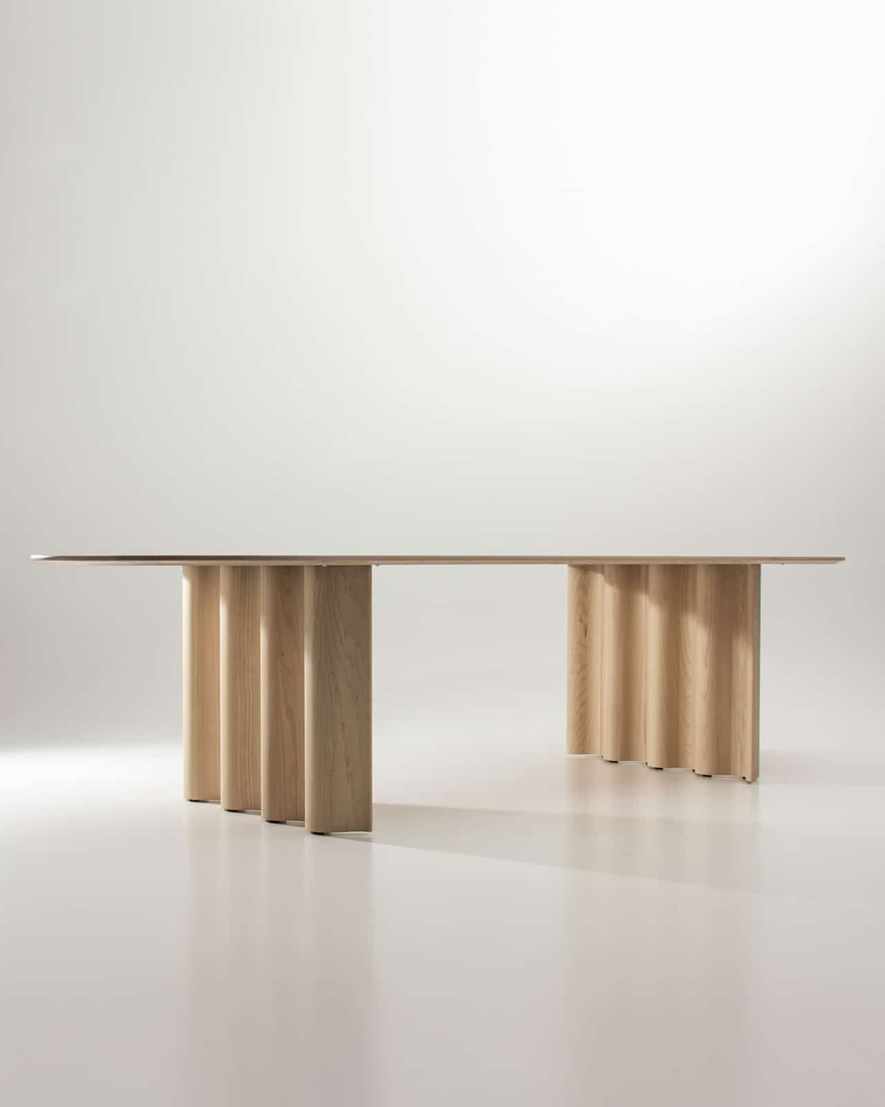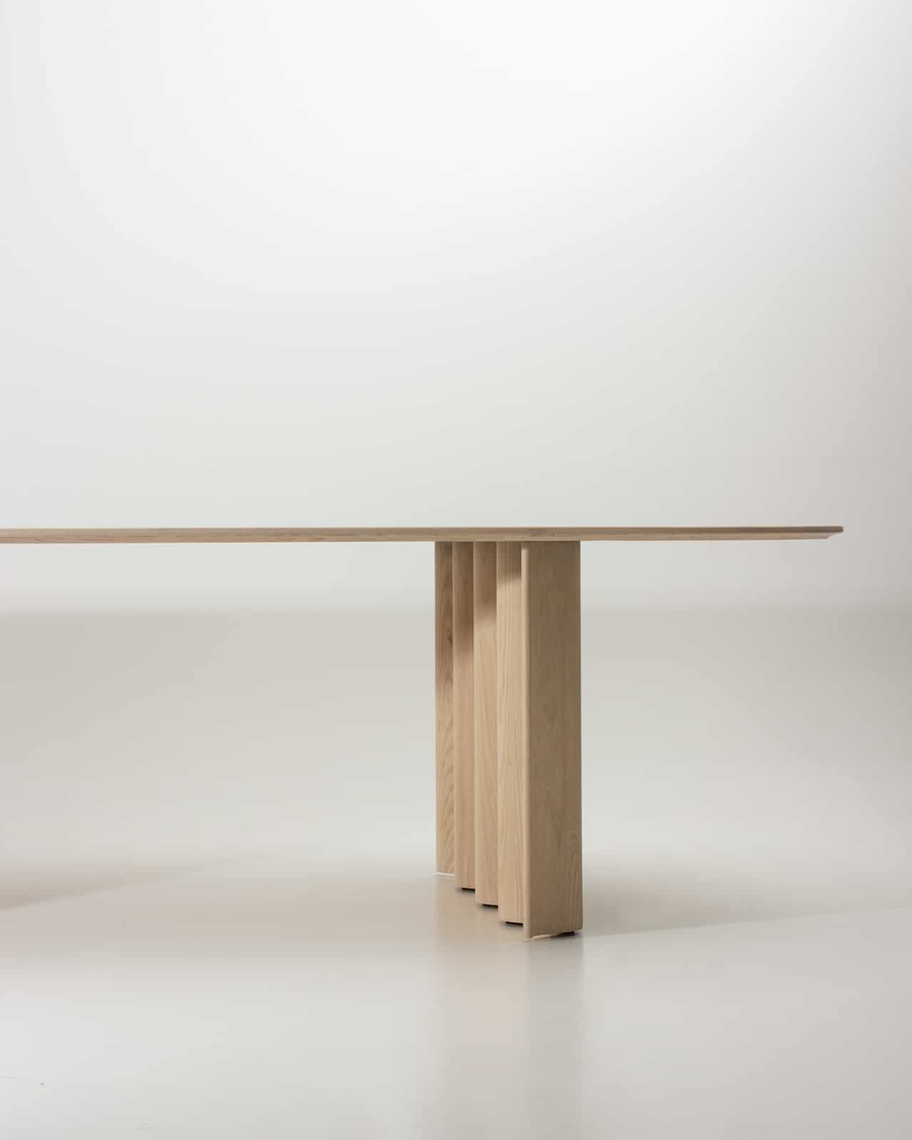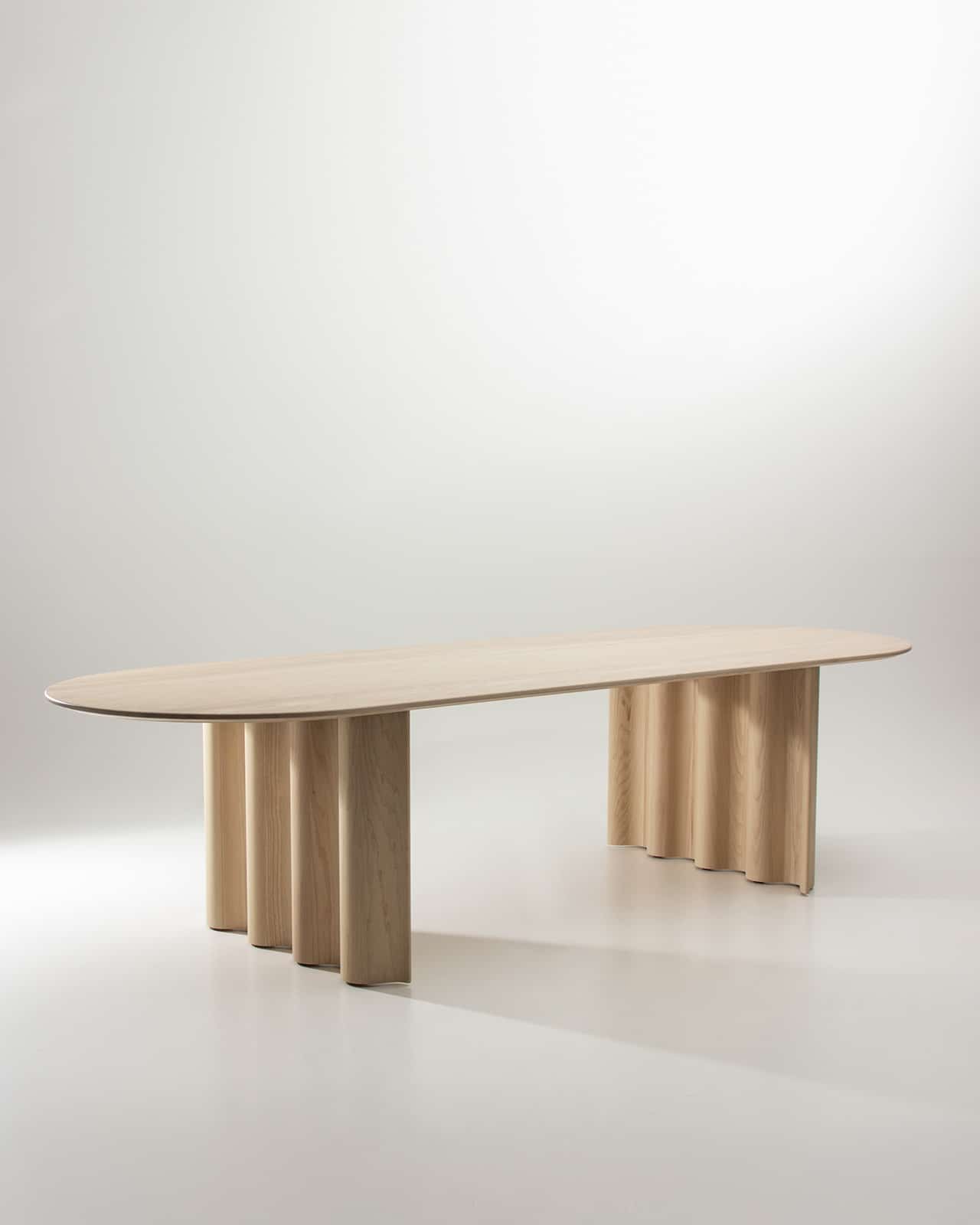 CURTAIN spielt – ähnlich einer Skulptur – mit unserer Wahrnehmung: Die Symbolik der Welle wird umso stärker, je mehr sich die Materialität des Massivholzes unterordnet. CURTAIN ist ein reiner Massivholz-Tisch: Die prägnante Form der Welle wird aus dem vollen Material herausgearbeitet, ein fast bildhauerischer Akt, interpretiert durch modernste CNC- Technik. Die Wangen werden anschließend sorgfältig von Hand geschliffen und geölt, die fließende Bewegung erwacht dadurch zum Leben.