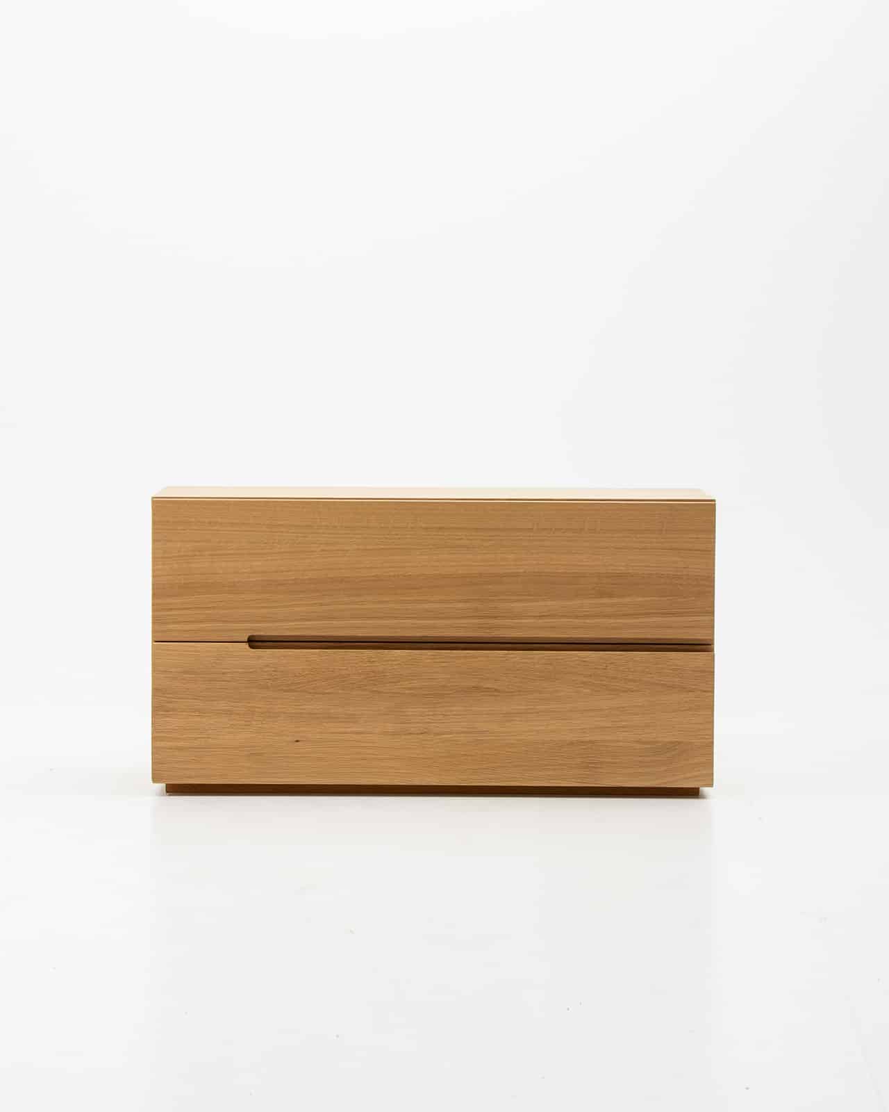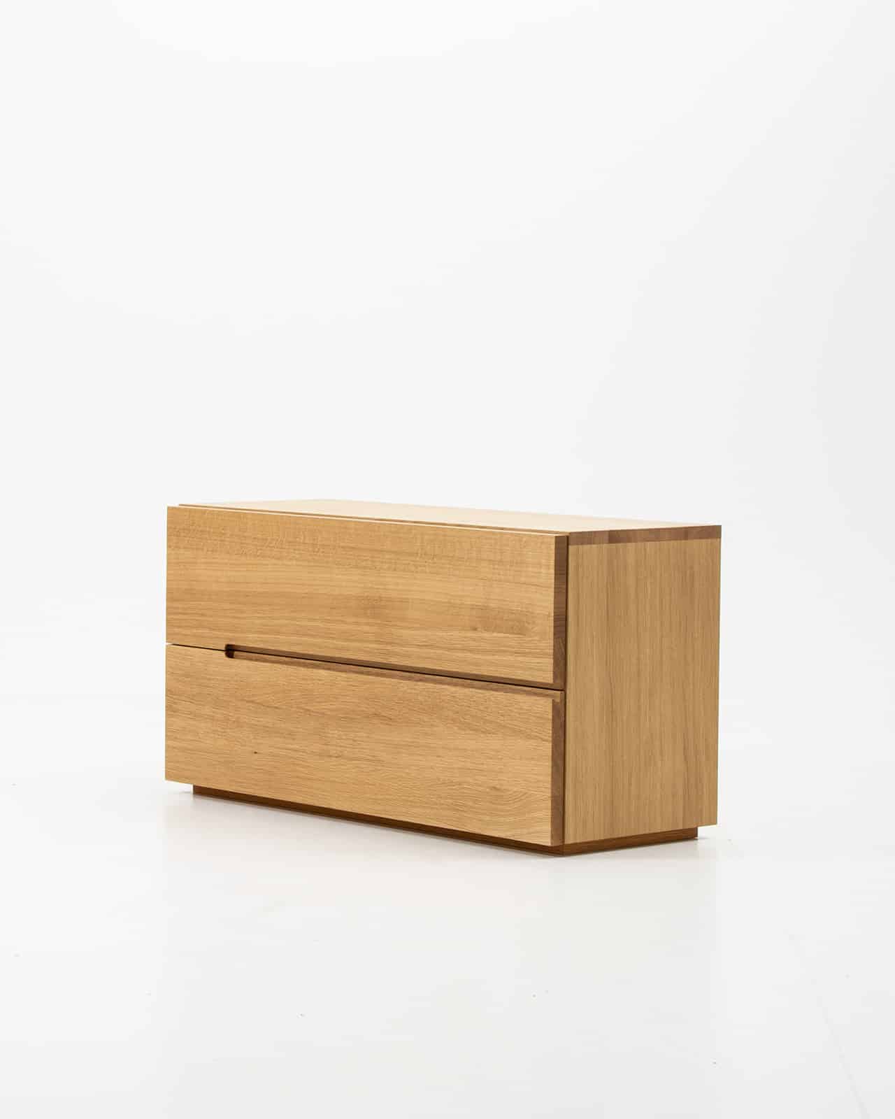 NIGHTSTAND links – ein flacher, kubischer Nachttisch bietet mit zwei Schüben ausreichend Stauraum am Bett. Durch seinen zurückhaltenden Charakter bildet er eine formale Einheit mit dem Bett und rahmt es wohltuend ein.