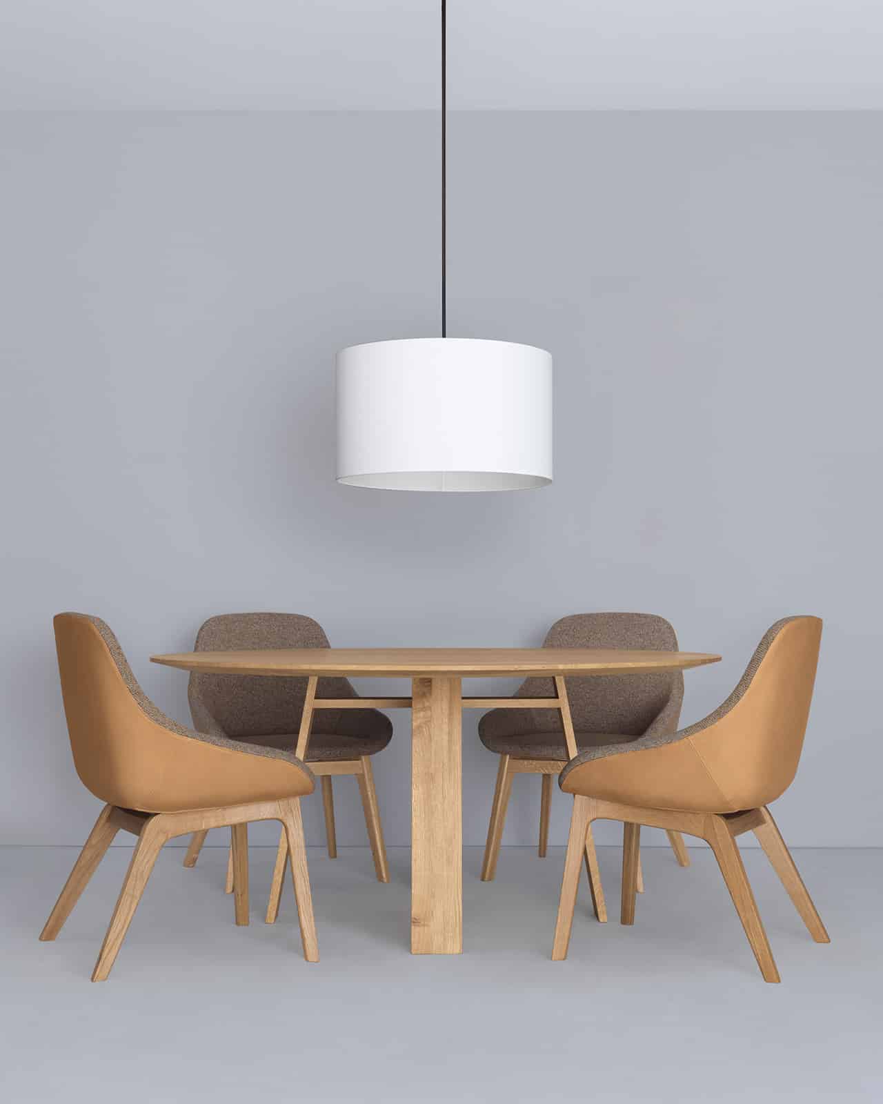 NOON 1 scheint wie ein Mond im Dunkeln. Der Lampenschirm ist erhältlich mit textiler Struktur in den Farben weiß, lichtgrau, warmgrau und schwarz. Das Textilkabel und den Baldachin gibt es in weiß oder schwarz. Form und Material sind ein Wechselspiel von Kontrasten: Die Lampenschirme aus Textil geben ein weiches Licht.