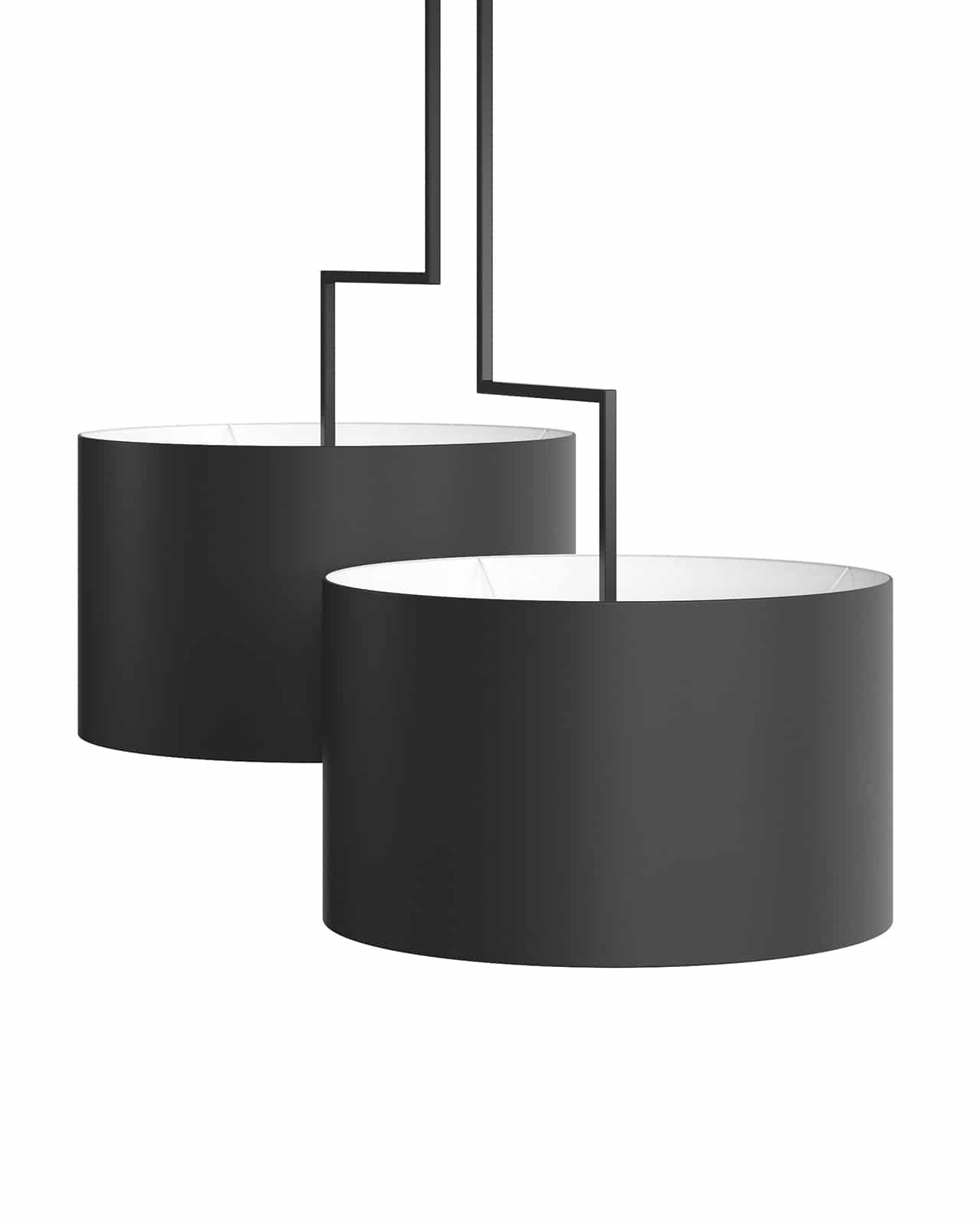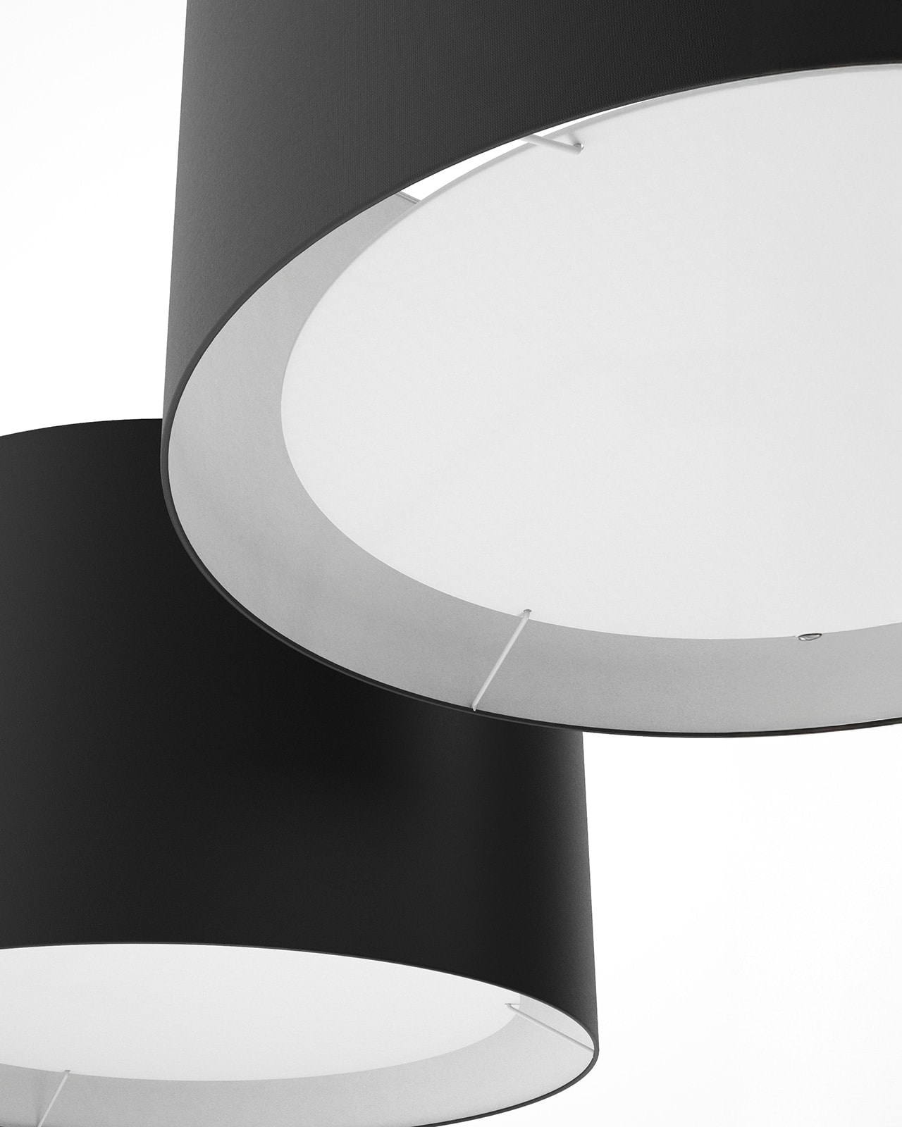 Schirm Textil schwarz | Gestell Eisen | Pulverbeschichtung matt schwarz | Blendschutz durch Pergamino-Diffusorscheiben unten | Leuchtmittel max. 15 W, E 27 (nicht im Lieferumfang enthalten) | Abverkauf