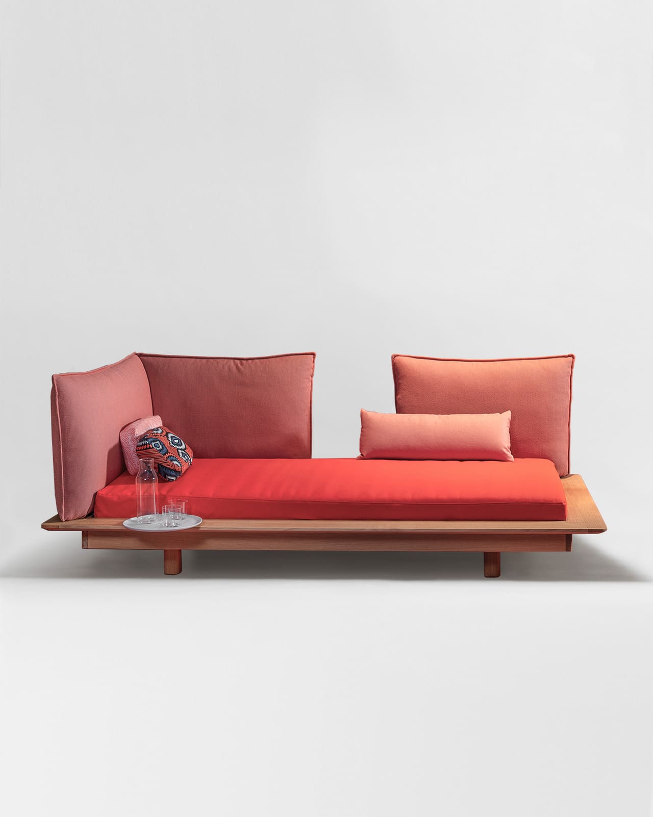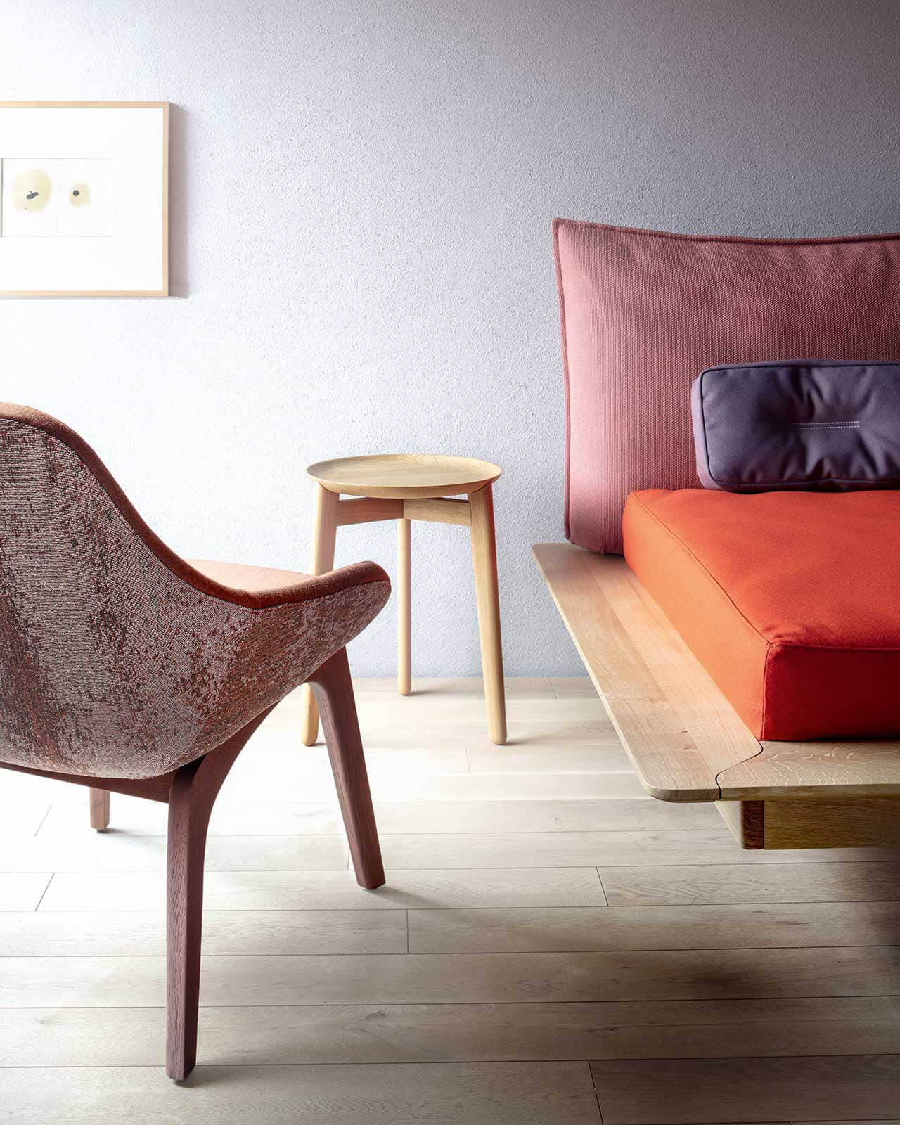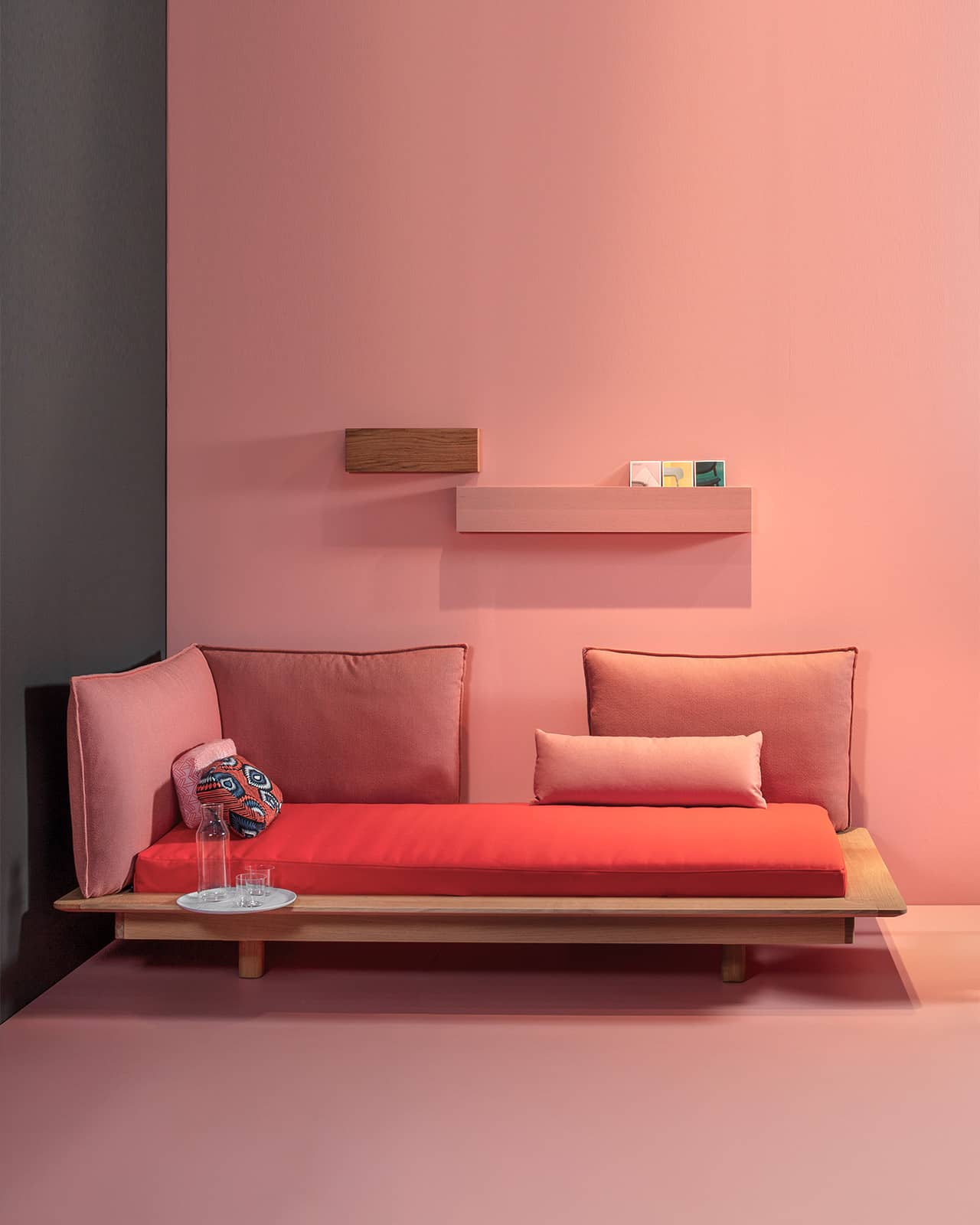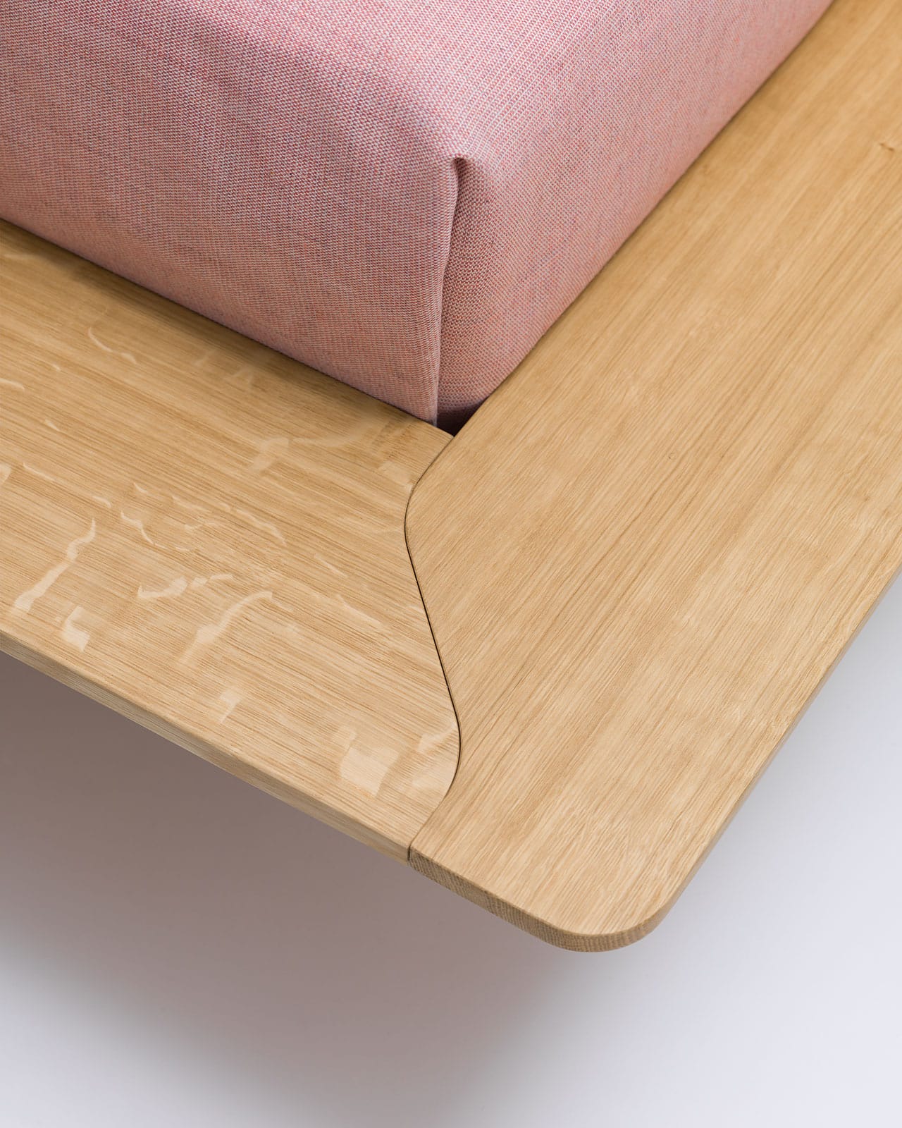 Puristisch, dennoch raffiniert. Spielerisch, nach Lust und Laune gestaltet. Das Bett YOMA interpretiert das Futonbett neu. Der Entwurf überrascht mit feinen Details: die Eckverbindung des breiten Bettrahmens, die als Welle ausgeformt, nicht nur optisch, sondern auch funktional ihre Bedeutung hat. Weich und einladend wirkt das Bett auch durch die abgerundeten Ecken und lädt dazu ein, es sich zum Schlafen, Lesen und Ausruhen gemütlich zu machen. Die Rückenkissen können an verschiedenen Positionen fixiert werden